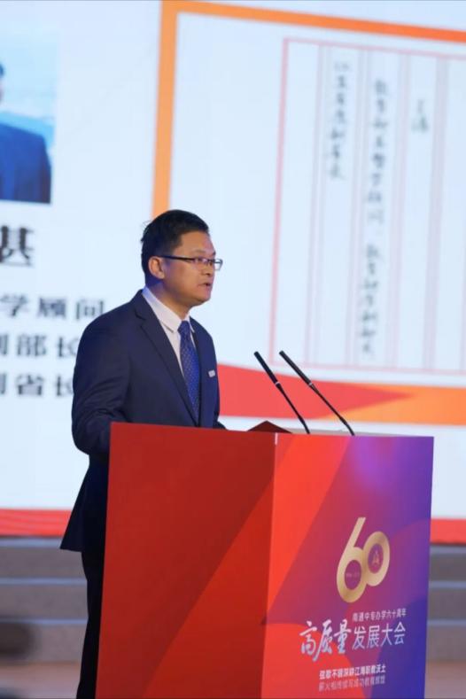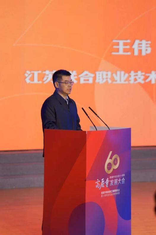 由万军校长来宣读贺辞,六十载春秋,南通中专于教有浪湖中勇数前行。为了让江苏省联合技术南通分院推动跨跃式发展,我校请到了江苏省联合职业技术学院院长王伟老师讲话。